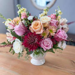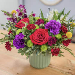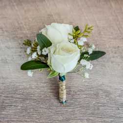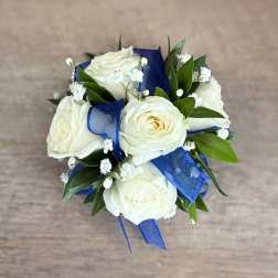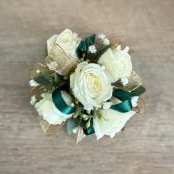 White Rose Corsage with Emerald Green & Gold Ribbon